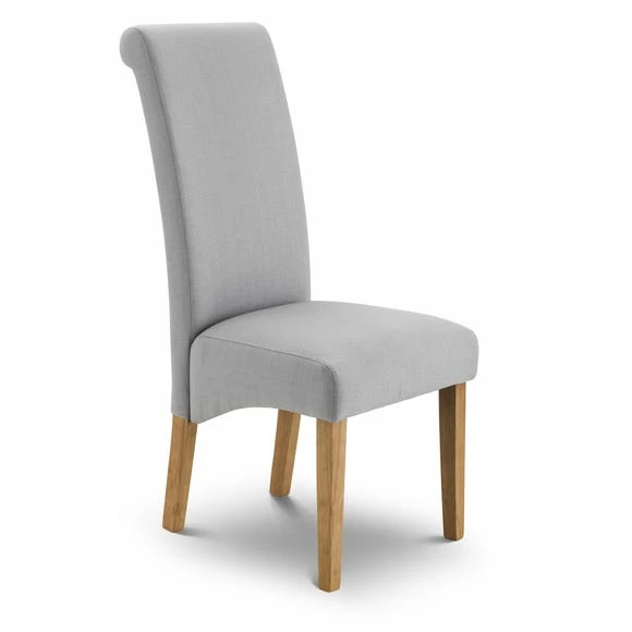 The Astoria dining set boasts a classic design with a chunky 40mm thick top in a sumptuous Waxed Oak finish. Made from the finest white oak and oak veneers, the Astoria features a 40cm butterfly extension system that is stored within the table when not in use.? This set comes complete with four dining chairs, upholstered in a durable and stylish grey linen fabric, complete with scroll back design, comfortable foam, sprung webbed seat and a solid wood frame.