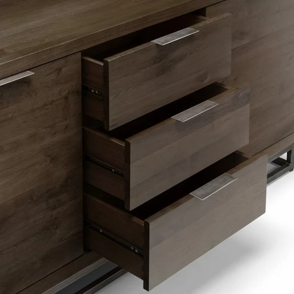 No matter the occasion, this Brooklyn sideboard is sure to make a statement. With its stylish industrial style metal legs and dark oak finish, this sideboard is sure to stand the test of time. Inside, you’ll find two spacious cupboards with shelves and three drawers, ideal for storing everything from wine glasses to keepsakes.