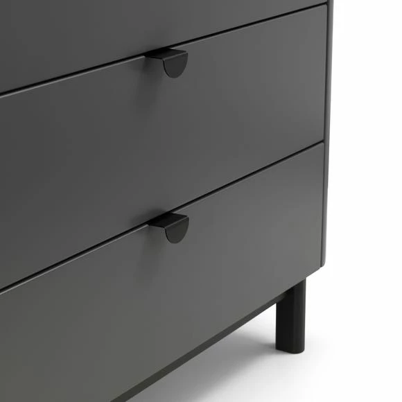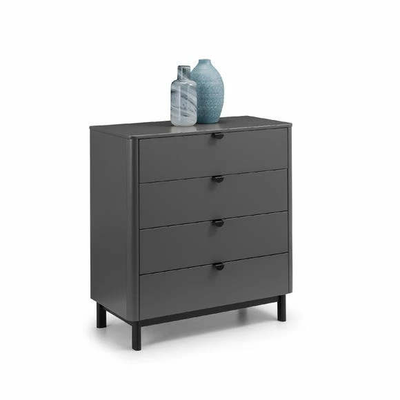 This chest of drawers is a great place to keep your extra clothes and other knickknacks. It has four deep drawers that keep everything neatly tucked away and out of sight, with rounded corners for a softer look. The storm grey finish with satin black wooden legs and handles adds a stylish look to any home.