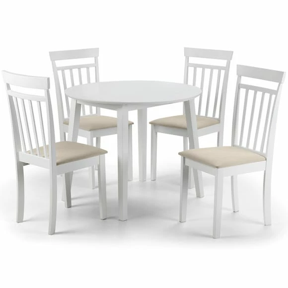 Boasting a clean, crisp look, this set fits seamlessly with both traditional and contemporary décor. Perfect for smaller spaces this dining table and chairs is space saving. For added comfort the dining chairs are gentle shaped and padded, so you can enjoy your dinner in comfort and style.