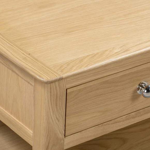 Crafted from solid oak and oak veneers, the Cotswold Coffee table boasts long lasting durability and a timeless design. Complete with silver handles, two spacious drawers and a large open shelf this fully assembled coffee table offers plenty of storage space and would make a great addition to any living room.