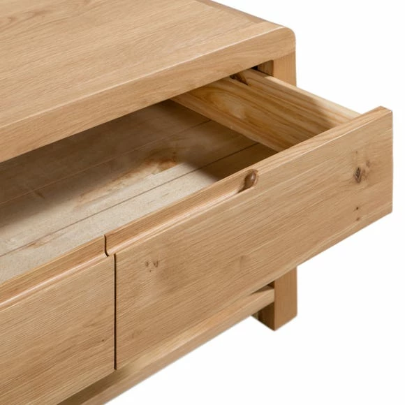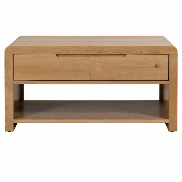 Crafted from solid oak & oak veneers, this coffee table is the perfect combination of classic and contemporary. With beautiful recessed handles and curved edging this coffee table is stunning. With a large top, this coffee table is perfect for displaying magazines, flowers or holding cups and plates.
