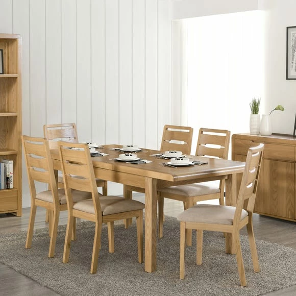 Crafted from solid oak and oak veneers, the Curve set of two dining chairs combine clean lines with a gentle curved ediging, adding a modern, retro feel to any dining area. Featuring a cut-out back to mimic the recessed handles the range has, these dining chairs feature padded linen seats, allowing you and your guests to reach maximum comfort.