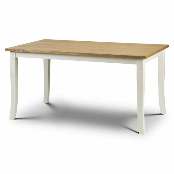 Crafted from solid rubberwood and a real oiled oak veneer 25mm top, this table is not only classic and modern but it is extremely durable. Perfect for any home, this table has an ivory lacquered finish and faux suede seat pads for added comfort and style. Other matching furniture is also available.