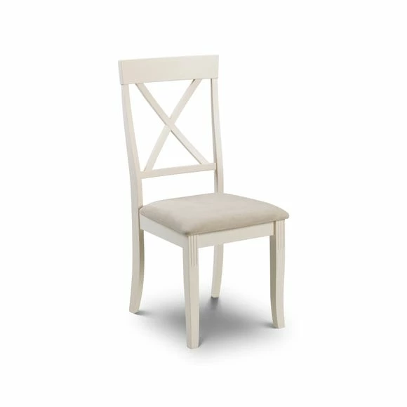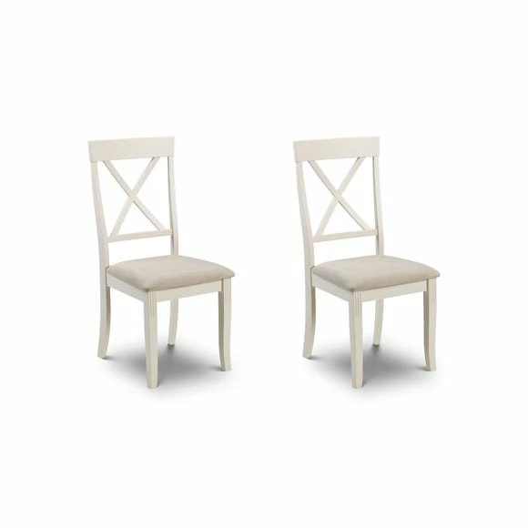 Constructed from solid wood and finished in an ivory colourway, the Davenport set of two chairs would suit any dining space. These self-assembly chairs feature an attractive cross-back design and come complete with comfortable, foam-filled seat cushions, upholstered in a soft faux suede fabric.
