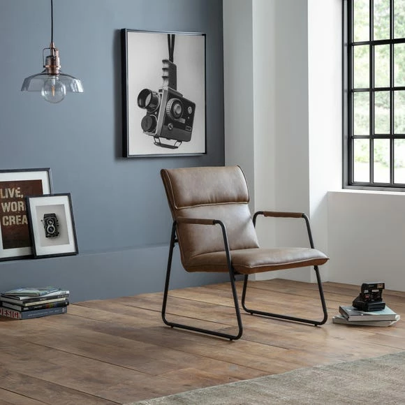 Upholstered in a soft touch, faux leather fabric, this simple and comfortable accent chair is a cosy and stylish addition to any living room or office space. Standing on a sturdy black metal frame with plush padded seats and a high back, this chair has a trendy industrial look that looks striking in any home and looks especially beautiful paired with other industrial, rustic, or modern decor pieces.