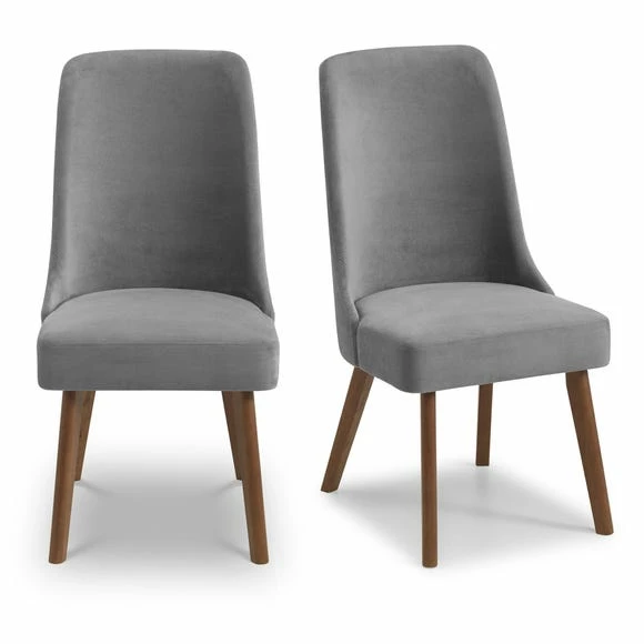 Designed with comfort in mind, the Huxley set of two chairs are upholstered in a soft grey chenille fabric, and feature foam-filled seats and gorgeous curved backs. Complete with walnut finished, tapered legs, these self-assembly dining chairs would be a great addition to any dining room.