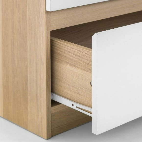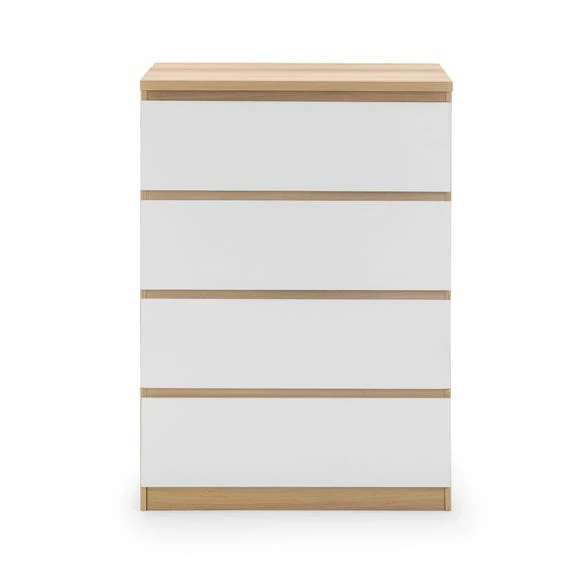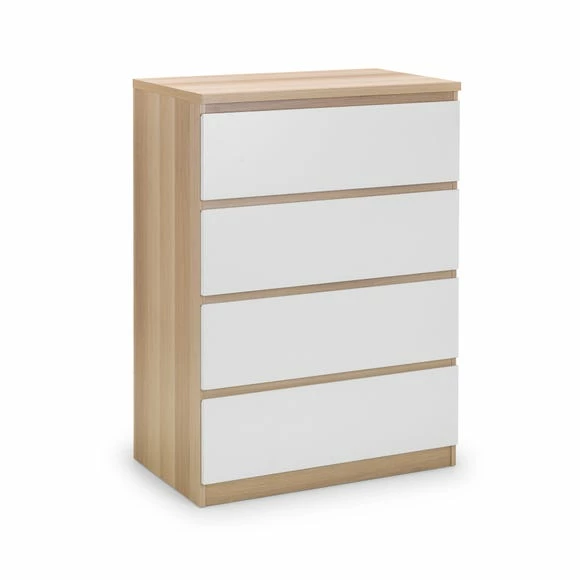 Perfect for adding a sleek, contemporary fininsh to any modern bedroom, the Jupiter 4 drawer chest features contemporary white high gloss drawer fronts and an oak effect frame. This self-assembly chest of drawers comes complete with four spacious drawers with a flawless, handleless design.