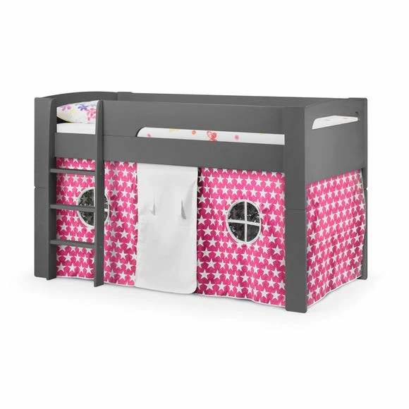 The Pluto Midsleeper with Pink Tent is a beautiful and sturdy mid-sleeper that transforms instantly into a fun and vibrant play space. The cleverly designed tent creates a cosy space where your child can be surrounded by their favourite toys and read, or tuck in for the night. The sturdy base is designed with solid wood slats, ensuring strong support for growing children who need a sturdy foundation for all the fun they will have in this fantastic raised bed. The Pluto Midsleeper is also designed for future flexibility – it can be converted to a single bed later on if required, making it an ideal bed for your growing child.